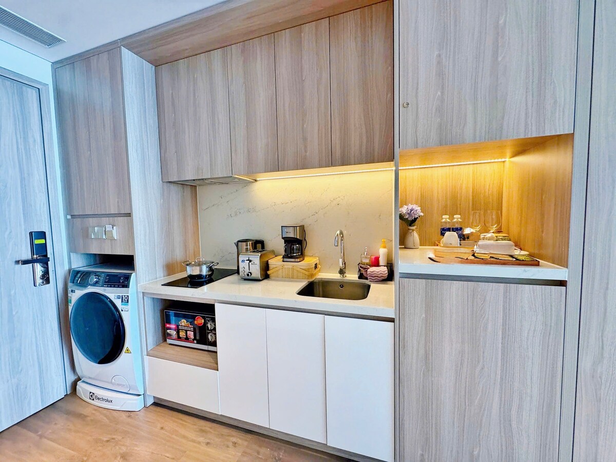 Todo lo que À La Carte Ha Long Residence traerá a los visitantes unas agradables vacaciones. - El apartamento está ubicado justo al lado de la playa, tiene una piscina infinita en el piso 40 y una piscina de cuatro estaciones en el segundo piso y un gimnasio (de pago). - Cuando me hospede en este maravilloso apartamento con servicios incluidos, puedo proporcionar té, café y agua gratuitos. - Wifi gratuito, aire acondicionado. - Jacuzzi. - Lavadora, secadora en el departamento. - La tetera eléctrica te ayuda a hervir agua para hacer té y café.