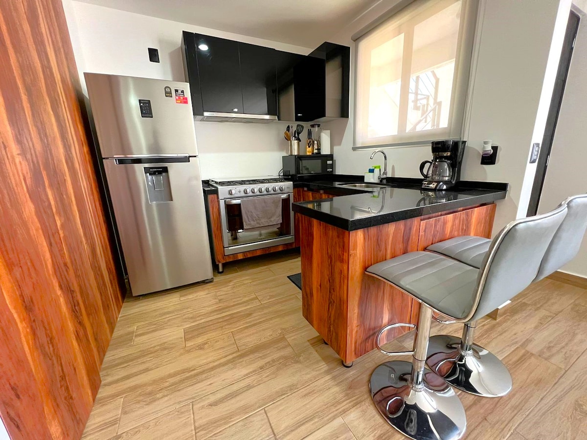 Hermosa suite Concepto boutique amueblado con toque antiguo pero totalmente equipado. Corazon del cento historico. Beautiful apartment located on pedestrian street in top location in downtown w/ amazing private rooftop. The apartment hosts 2 people it’s fully equipped with private bath, kitchen and dinner. Walking distance everywhere in downtown Querétaro. The place is clean quiet and full of design. Agradable terraza Caja de seguridad Baño Cama queen size Comedor Sala 49m2