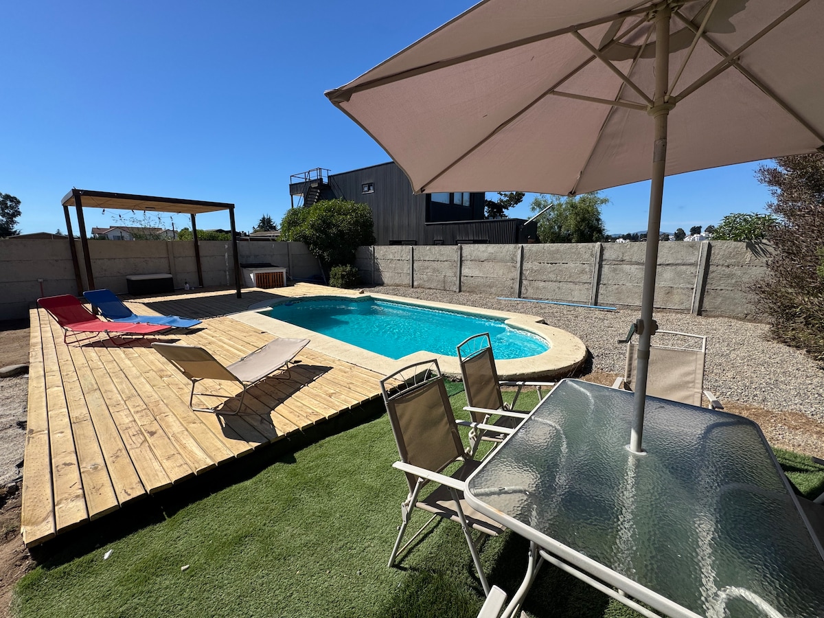 Excelente y tranquila casa privada totalmente equipada con piscina y tinaja privada en Olmué, en una parcela de 2 mil metros². Estamos entre el paradero 33 y 34 del sector de Granizo, a pocas cuadras de la calle principal en un sector familiar. A 2km del centro. La casa tiene 3 habitaciones, 1 matrimonial, 2 habitaciones con 2 camas, 1 baño y cocina totalmente equipada. Contamos con chimenea tipo bosca en la sala de estar y con terraza techada delante de la piscina. Somos pet friendly!!