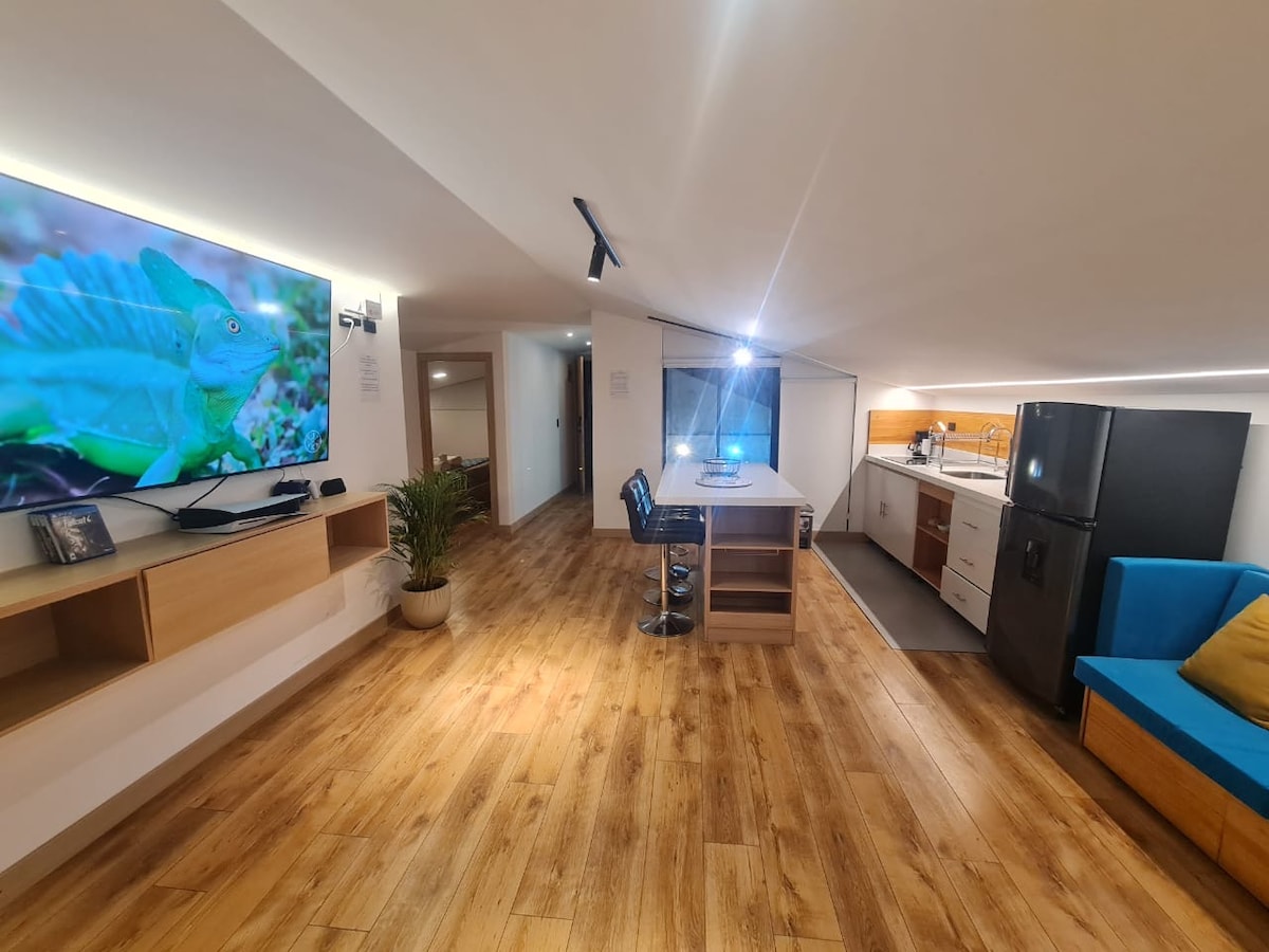 Espacio acogedor lleno de confort con un jacuzzi privado y una sala espectacular con cine en casa y descansa en una cama king en un ambiente tranquilo, agradable y seguro 2 habitaciones y 1 sofa cama, Smart TV, Wifi Rapido, Netflix cocina dotada con todos los elementos esenciales, cerca al centro, a minutos de los principales parques y centros comerciales. Chimenea eléctrica Lavadora y secadora para que no necesites salir del lugar. Se encuentra a 15min al Aeropuerto y Terminal de transporte.