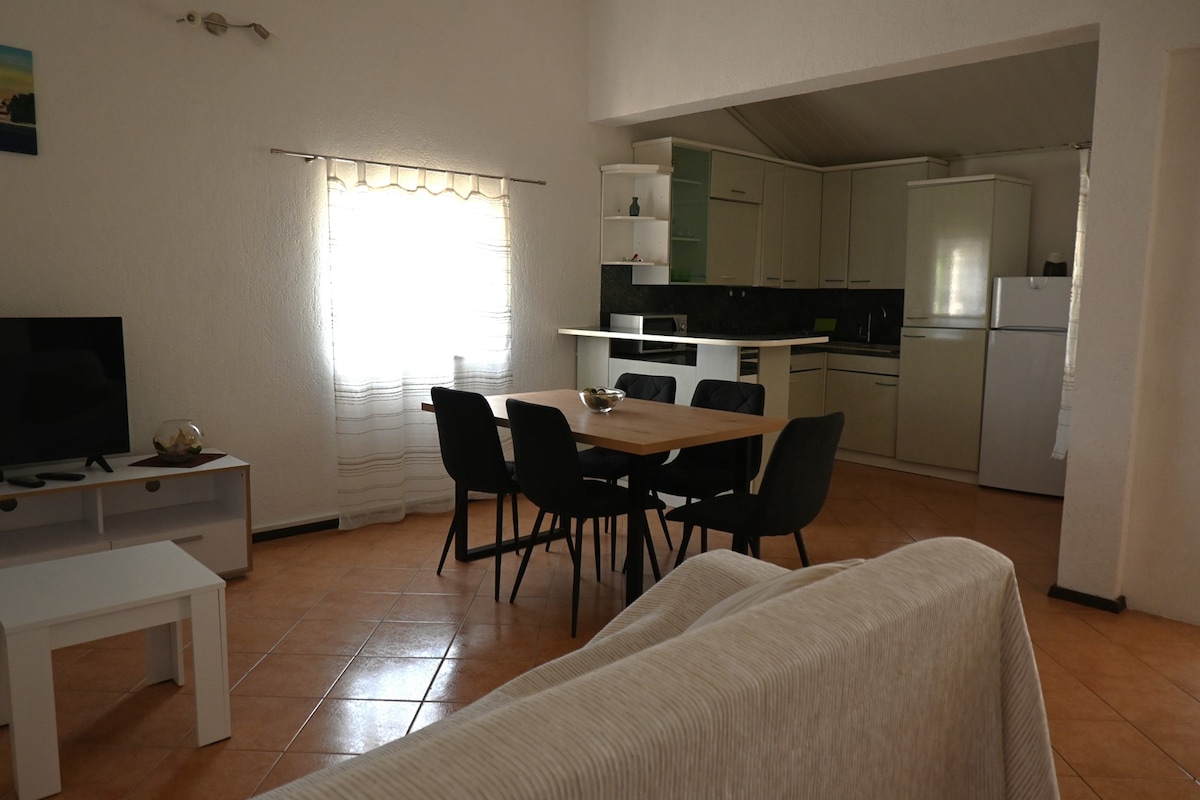 Apartman se nalazi u obiteljskoj kući na prvom katu s posebnim ulazom. U njemu se nalaze dvije spavaće sobe s tuš kupaonicama i balkonima koje gledaju na more. Dnevni boravak je smješten ja sjevernoj strani zajedno sa kuhinjom i terasom. Apartman je novo uređen i klimatiziran te svega 80 m od plaže i mora.