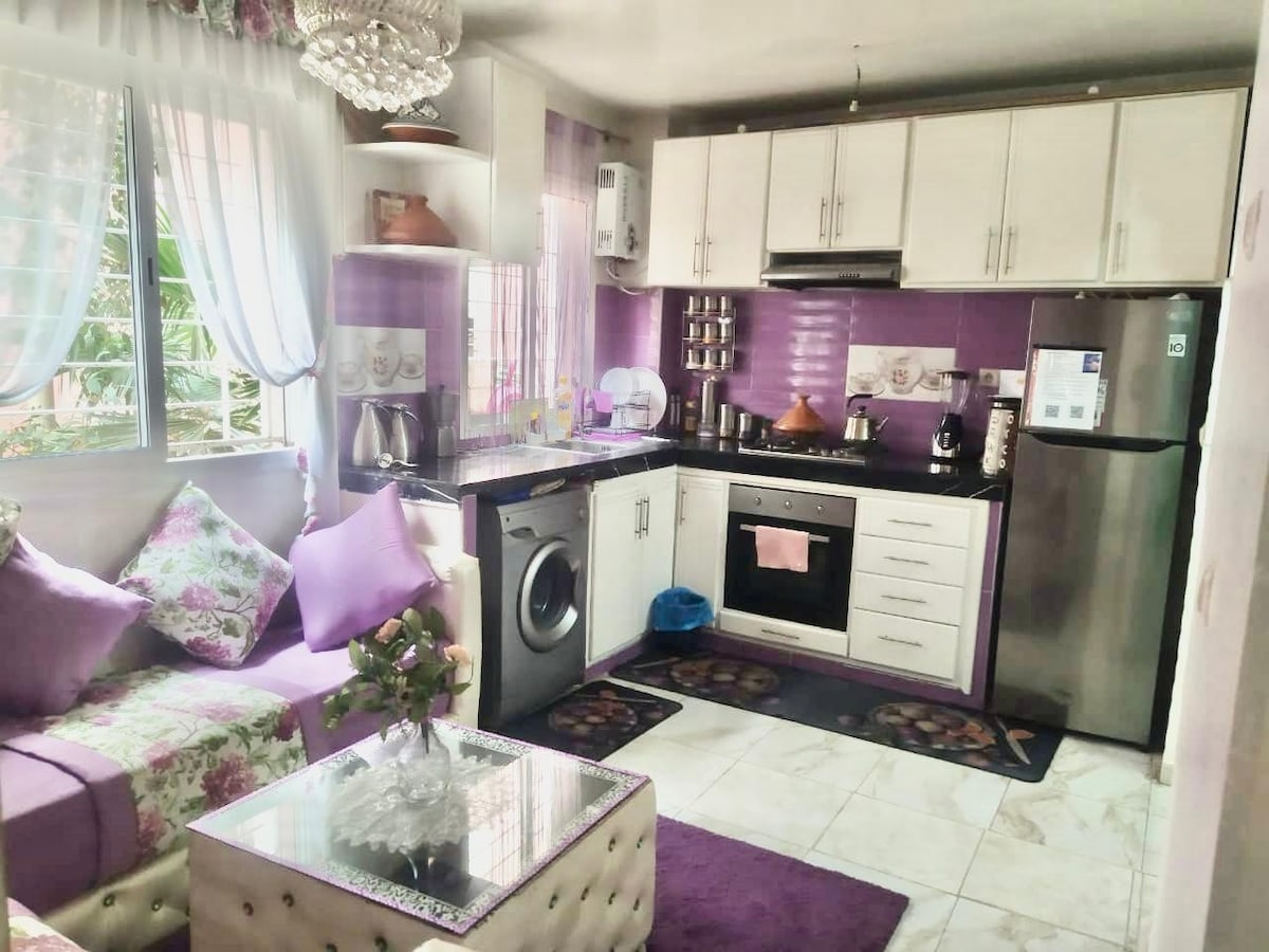 Un charmant appartement,Situé au rez-de-chaussée, pratique pour ma personne âgée. vue sur jardin, idéalement situé dans un endroit calme, à seulement 15 minutes de la ferme des loisirs, la plage, les jardins exotiques, Magic Parc, la gare ferroviaire et la tour Mohammed VI. À proximité de marina et l'aéroport de Salé. Avec son goût raffiné, propreté optimale et équipement complet, cet endroit offre un cadre confortable pour votre séjour, vous permettant de profiter de votre temps de détente.