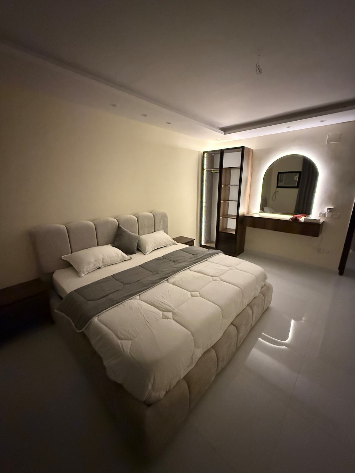 ـ شقة فاخرة هادئة بدخول ذاتي وتصميم عصري انيق مكونة من صالة بكنب مريح وشاشة ذكية ـ غرفة نوم بسرير كنق وتسريحة وخزانة توفر مساحة تخزين كافية - الموقع قريب من جميع المناطق الحيوية والخدمات والمطاعم