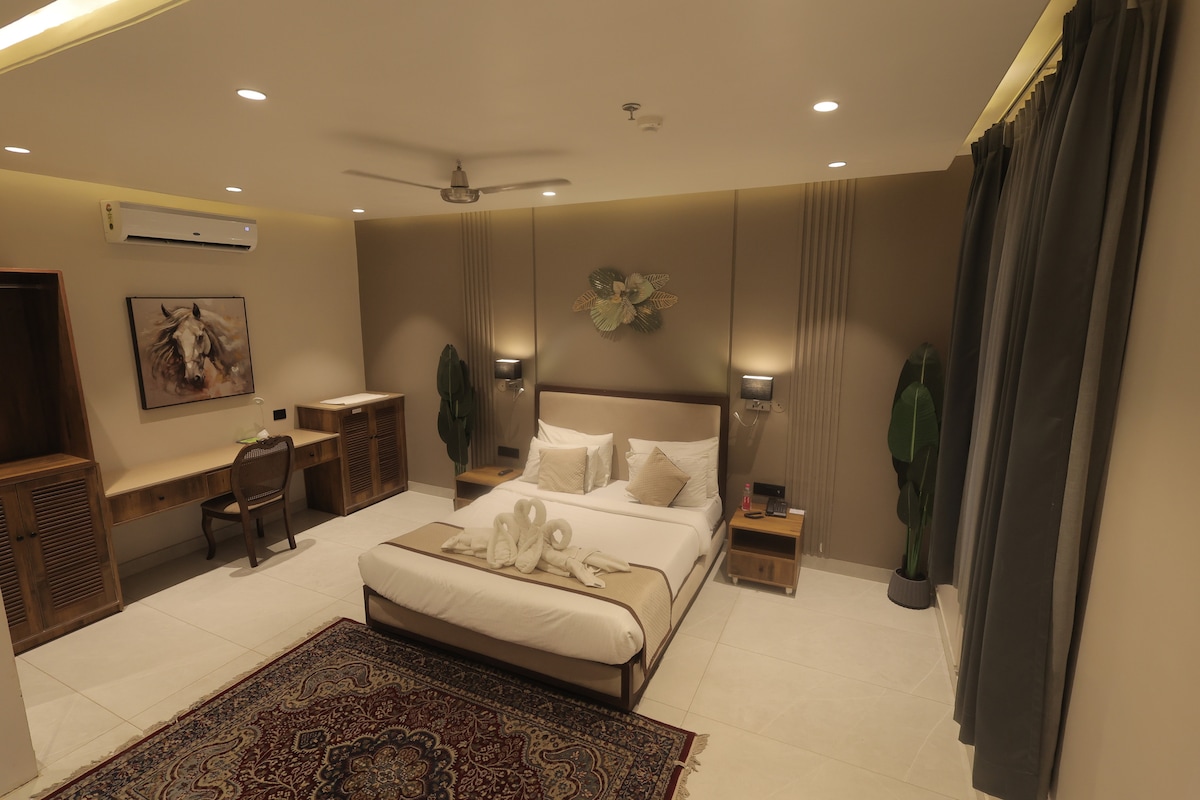 Esta habitación de lujo cuenta con 1 cama grande o 2 camas individuales, junto con una cama supletoria, perfecta para un máximo de 3 huéspedes. A solo 5 minutos de la puerta de entrada del Taj Mahal, este Airbnb ofrece un espacio impecable y bien mantenido con estándares de servicio excepcionales. Disfruta de una piscina, un salón de bar, un gimnasio, un spa y camas acogedoras, todo lo que necesitas para una estancia perfecta. El personal servicial y atento siempre está listo para ayudarte. Tanto si viajas por placer como por trabajo, te garantizamos una experiencia de hospitalidad inolvidable.
