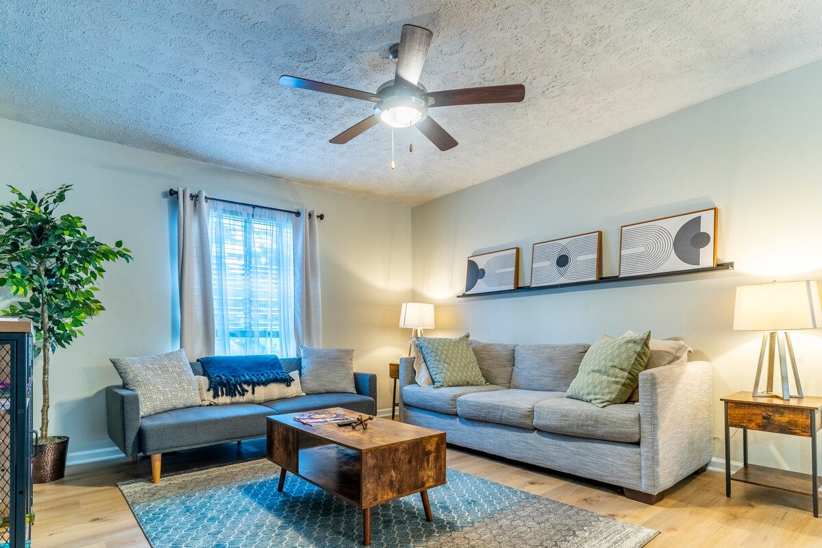 La casa de 4 dormitorios y 2 baños es perfecta para familias, amigos o viajeros de negocios. Lo más destacado es el gran patio trasero privado y vallado, diseñado para noches relajantes y reuniones divertidas. Disfruta del putting green, el área de picnic, la chimenea, la parrilla y el amplio porche amueblado, todo iluminado con acogedoras luces de cuerda. Estacionamiento disponible en la parte trasera o en la entrada. En el interior, el alojamiento cuenta con: Una cocina abierta totalmente equipada Televisores inteligentes con wifi rápido Lavadora y secadora Baños con jabón y champú