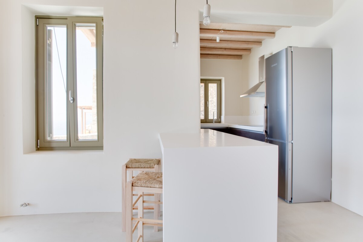 Authentic and stylish Cycladic house in the heart of Apollonia, featuring a private terrace and rooftop space perfect for relaxing evenings after exploring the village. The upper independent apartment of this 1900 restored villa, boasts two double bedrooms, one with ensuite bathroom and a second bathroom, a perfectly equipped and stylish kitchen, a small living room and an astonishing veranda for wine, cocktails and amazing dinners.