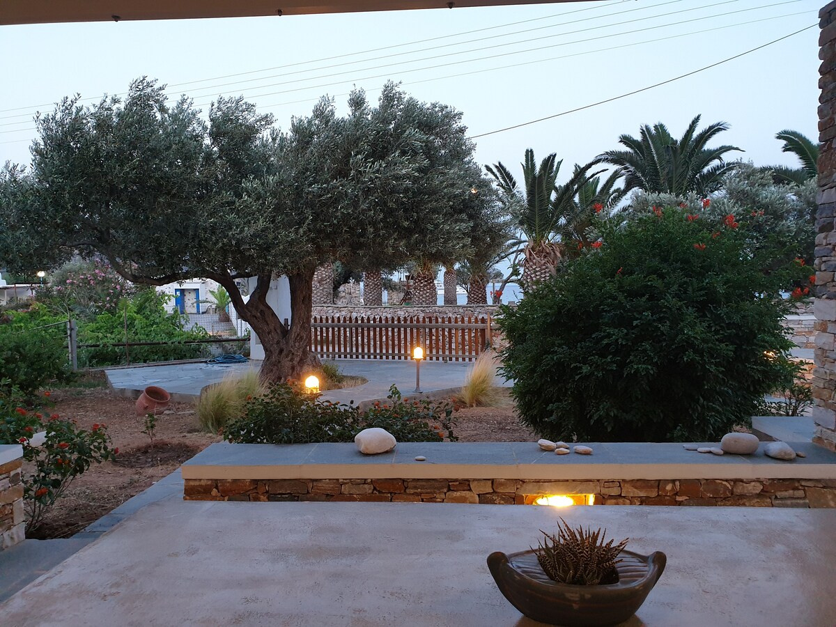 Traditional island house on the beach. Located in a complex, on the quiet beach "Karavi", a short distance from the port (13 ' on foot). The house is 90 sq. m. fully equipped and is divided into two levels. On the lower level are the two bedrooms, the living room and the two bathrooms. On the upper level is the kitchen and living room in an open space. The outdoor area consists of two terraces. There is private parking next to the house only for the residents of the complex