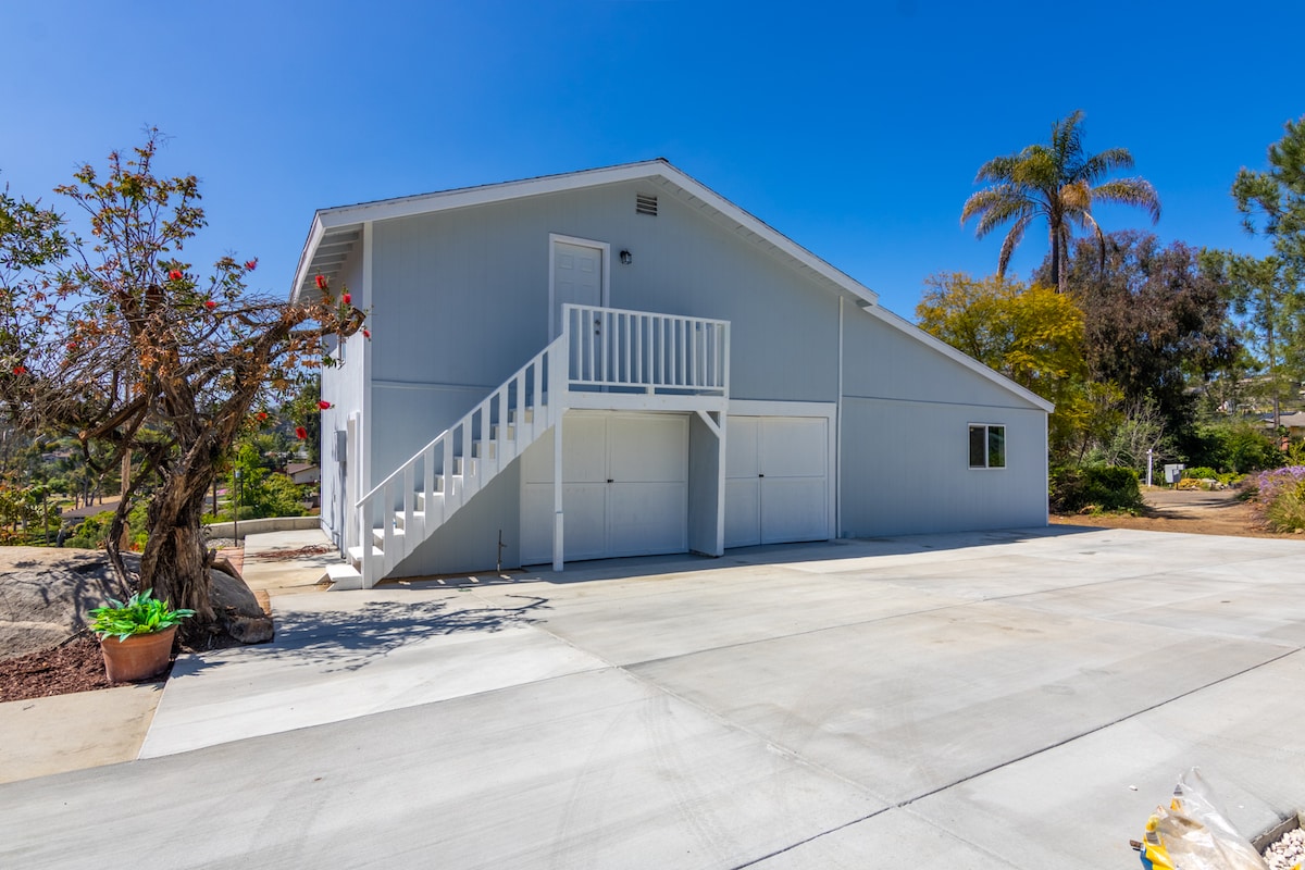 Contempla el amanecer y el atardecer desde esta casita panorámica en la cima de una colina. Disfruta de una escapada encantadora con vistas panorámicas a las montañas y valles. Disfruta de un refrigerio en el patio privado mientras contemplas las palmeras y las interminables colinas. Situada a 15 millas de la playa y a 20 minutos de muchas de las principales atracciones de San Diego. Nota: Actualmente tenemos un proyecto de renovación al aire libre en proceso detrás de la casita. Puede haber días durante tu estancia en los que se realicen trabajos al aire libre.