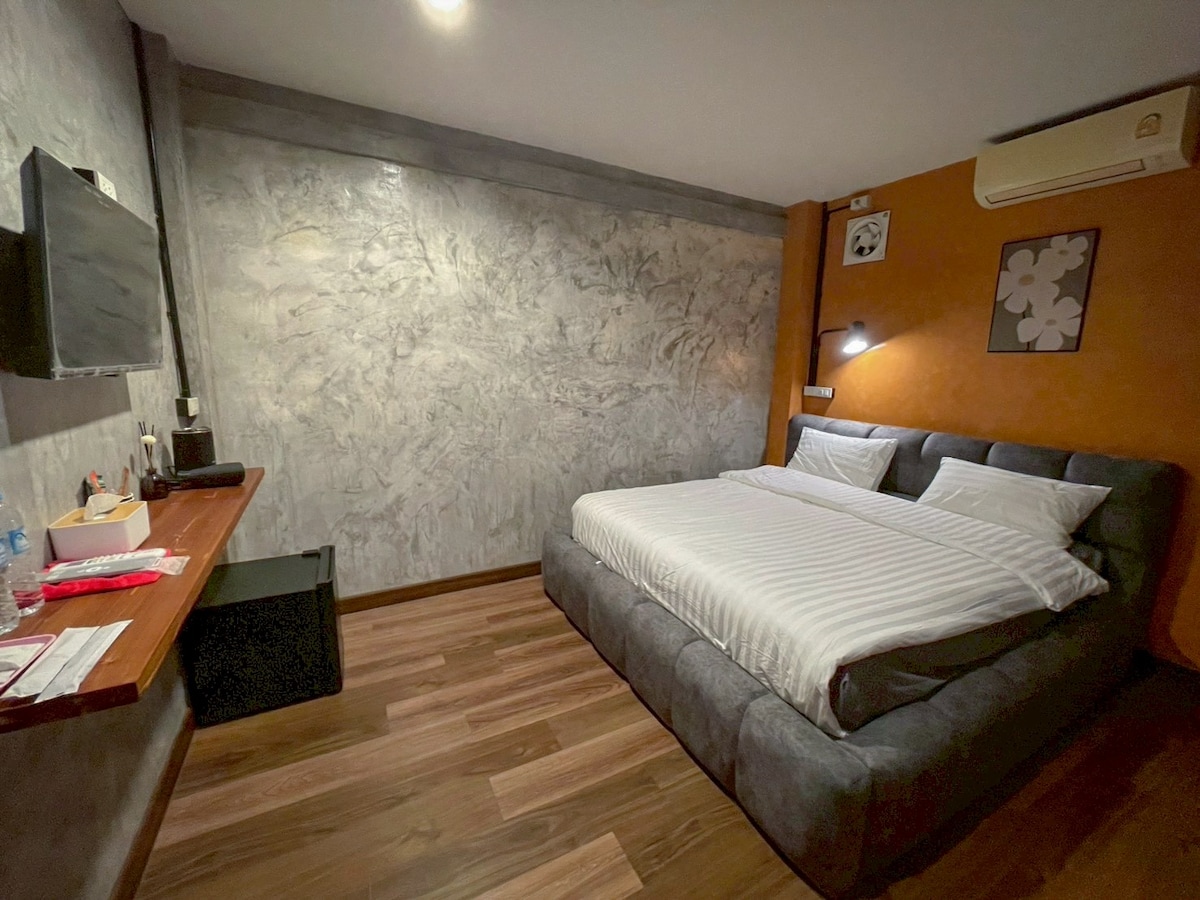 Esta es una habitación privada de 13,5 metros cuadrados, tiene 1 cama tamaño queen y baño privado (integrado). Pantalla plana y aire acondicionado. Renovamos nuestro alojamiento de una antigua casa china. La decoración interior está inspirada en el estilo de vida tailandés-chino local. El edificio tiene 2 plantas con balcón adicional en la azotea. Nuestra ubicación está en el barrio chino, a unos 100 metros de la estación de Wat Mongkhon (MRT). El nombre del edificio es Live Local Yaowarat Cafe & Hotel.