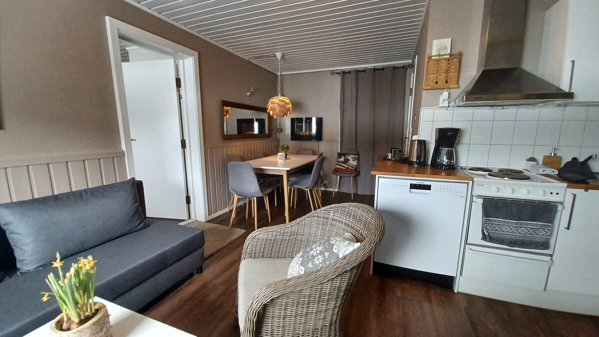 Apartamento en propiedad agrícola dedicada a la producción de leche. Las vacas y los terneros pastan por la granja. La propiedad tiene una larga costa e instalaciones para nadar. Gazebo en el jardín. Se encuentra a una hora de la casa. Preciosas vistas de los fiordos y las montañas. Posibilidades de pesca en el mar. Buenas posibilidades para hacer senderismo en la zona cercana. A 300 metros de la tienda de comestibles, el parque infantil, el contenedor de bolas y el sendero para bicicletas.