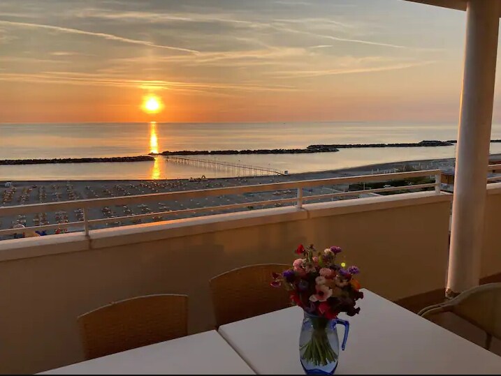 Tra cielo e mare es un ático en el quinto piso con una vista espectacular al mar. Con fácil acceso al sendero peatonal y ciclista. A pocos minutos de la entrada de la autopista A14 y en una posición estratégica para llegar a la Fiera y Palacongressi, es la solución ideal para vacaciones, para viajes de negocios y fines de semana para parejas dedicadas a relajarse, buena comida y nuestra hospitalidad. De mayo a septiembre se alquila solo de sábado a sábado con estacionamiento gratuito y descuentos en el restaurante Maraviglia.
