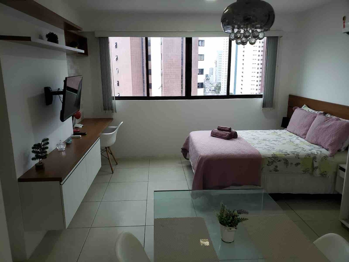 Studio confortável e bem decorado num prédio com estrutura excelente e muito bem localizado no bairro de Boa Viagem. O prédio é excepcional com destaque para o Rooftop que é de tirar o fôlego com piscina aquecida e hidromassagem. Ainda conta com academia, lavanderia inteligente, mini mercado, recepção 24h, coworking, guarda volumes e garagem. Próximo à praia (8min de caminhada), ao aeroporto (10min de carro), de padarias, supermercados, restaurantes, salões de beleza, barzinhos e farmácias.
