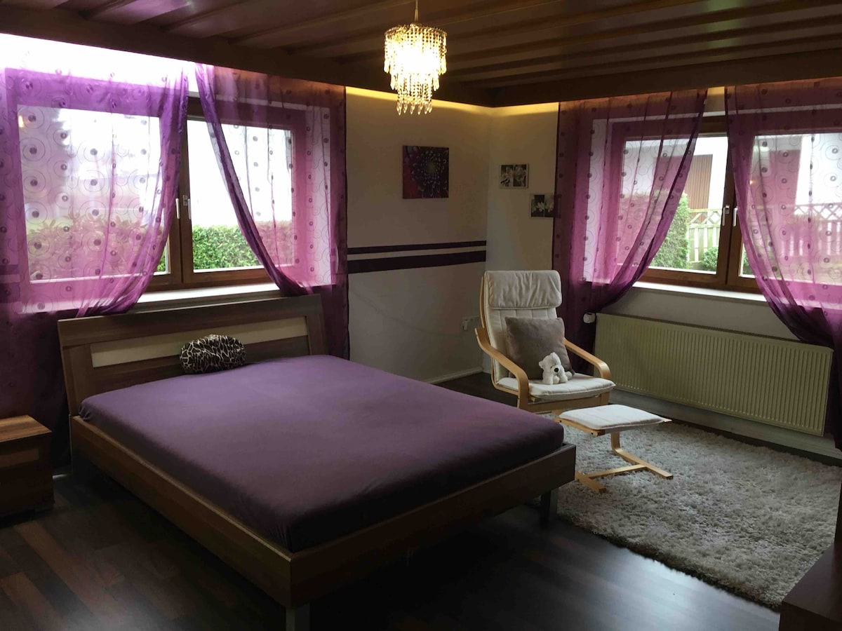 Amplio departamento de planta baja (aprox. 130 metros cuadrados) en una ubicación idílica. Entrada independiente con zona de estar cubierta, pequeña terraza solárium y acogedora cocina equipada. El apartamento tiene conexión wifi, TV por satélite, calefacción central y estacionamiento gratuito. También hay instalaciones de almacenamiento para bicicletas y motocicletas. McDonalds, panadería y supermercados (Rewe, V-market) a solo 500 m y a poca distancia a pie.