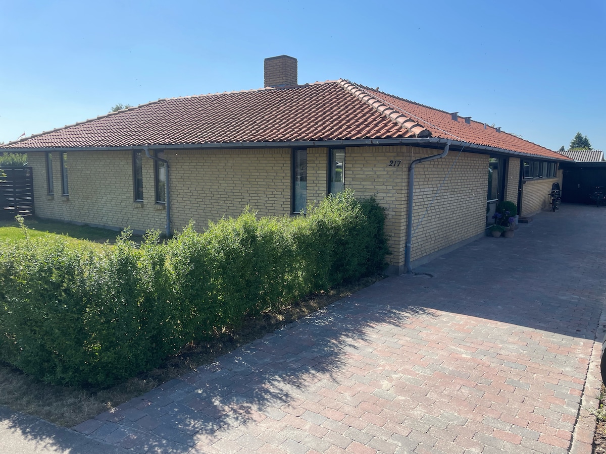 Tienes fácil acceso a todo desde esta base perfectamente ubicada. Recientemente renovado con cocina y baño nuevos. Ducha de lujo. Planta baja: cocina, baño, sala de estar con TV, cama continental en el dormitorio, oficina y pasillo. Primer piso: dos habitaciones y sala de estar adicional con sofá + jabón en la planta. Una habitación con colchón de caja y una habitación con litera junior. 1,5 km Torv, Musikhuset, Torre del Agua 1,0 km de tiendas Broen, cine, hospital, hospicio, calle peatonal, estación de tren +tiendas + Pizzaria
