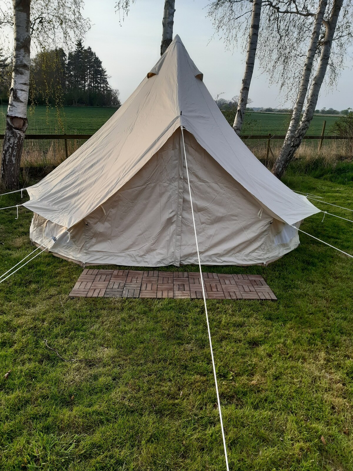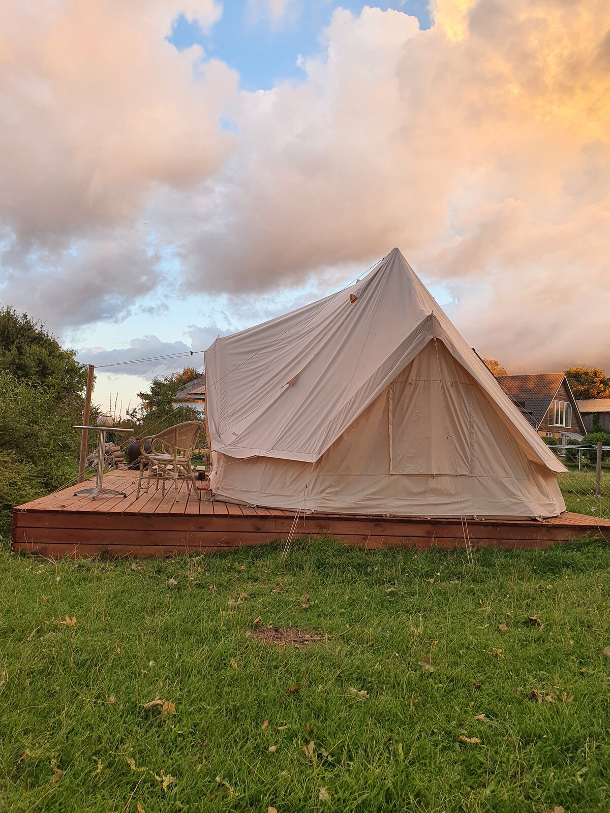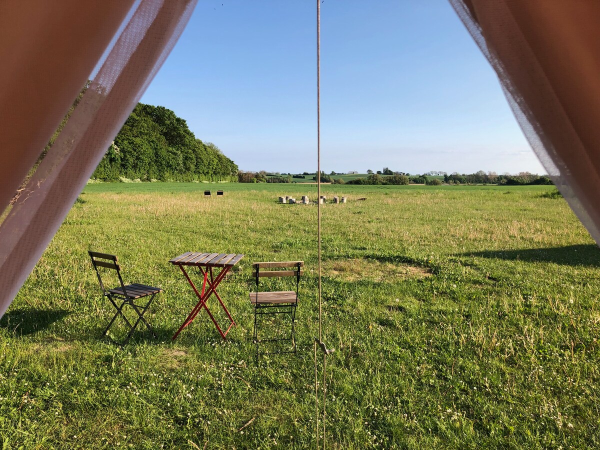 Una cálida bienvenida en mi acogedora tienda de campaña que he enumerado en mi patio trasero. Hay espacio para 4 personas y he amueblado mi pequeño oasis con una mininevera, para que puedas, por ejemplo, poner una botella de vino rosado en hielo y disfrutar de la puesta de sol y la vista de los campos con una copa de vino fresco. Hay muebles de jardín, una barbacoa y una chimenea. Como huésped, también tienes acceso a un inodoro con ducha y a una cocina totalmente funcional, y si tienes un bebé, estaré encantado de proporcionarte una cama de bebé. Saludos cordiales, Gitte