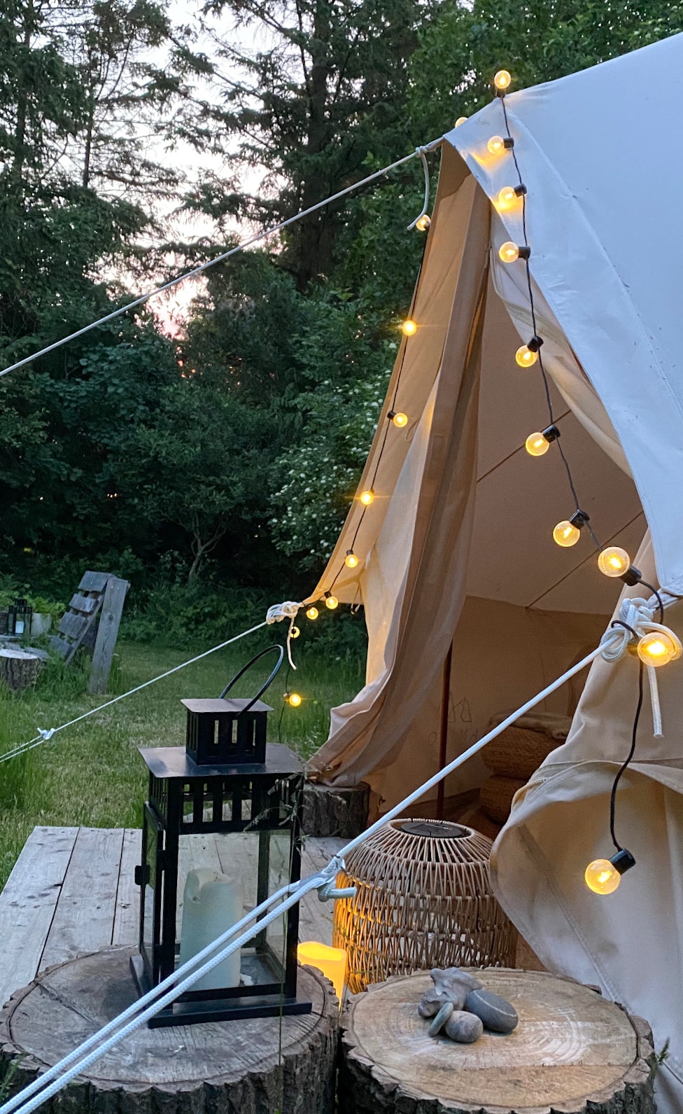 Glamping en un jardín grande e idílico en una zona tranquila donde puedes escuchar cada canto de los pájaros y relajarte de la mejor manera posible. La tienda en sí es espaciosa y emana lujo en forma de dos buenas camas, una sala de estar con hermosas sillas, una mesa y alfombras, velas perfumadas e iluminación suave para la comodidad tanto del cuerpo como del alma. También hay una encantadora zona al aire libre con dos sillas y una mesa, donde se puede disfrutar de la noche en paz y tranquilidad. Solicita opciones para paquetes de desayuno y cena.