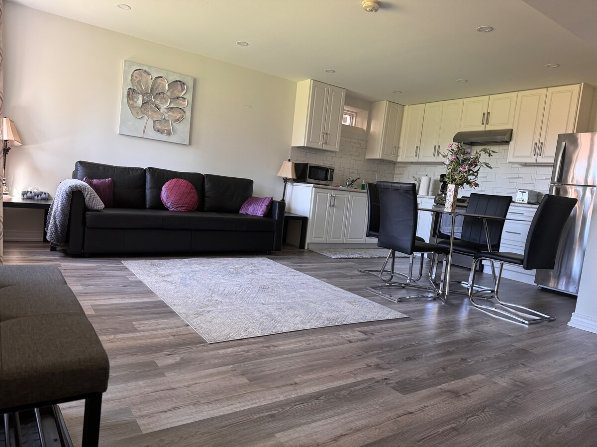 Apartamento recién terminado con grandes ventanales y luminoso concepto abierto. Entrada independiente, lavandería y secadora privada a estrenar. Insonorización, fácil acceso a tiendas, restaurantes, clínica sin cita previa y farmacia a solo 7 minutos a pie. - llegada autónoma con código - A sólo 3 minutos de la parada de autobús. - Cocina totalmente equipada - Estacionamiento para un vehículo - Vecindario Residencial seguro y amigable justo al norte, a 30 minutos en auto del centro de Toronto. Hay muchos senderos para caminar y parques cercanos.