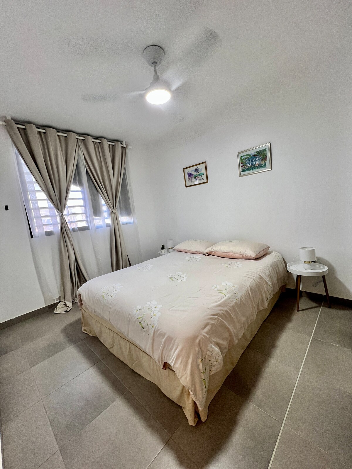 Très élégant appartement au style unique, superbement aménagé et décoré, situé dans une résidence calme et sécurisée avec piscine et régisseur. Sa cuisine équipée et aménagée est ouverte sur un spacieux salon, donnant lui même sur une terrasse couverte avec vue sur l'océan. Cette conception du logement assure donc une bonne ventilation par les Alizés. La grande chambre est équipée d'un lit Queen Size 160 cm, ainsi que de la climatisation. Enfin, la salle d'eau avec douche à l'italienne et WC.
