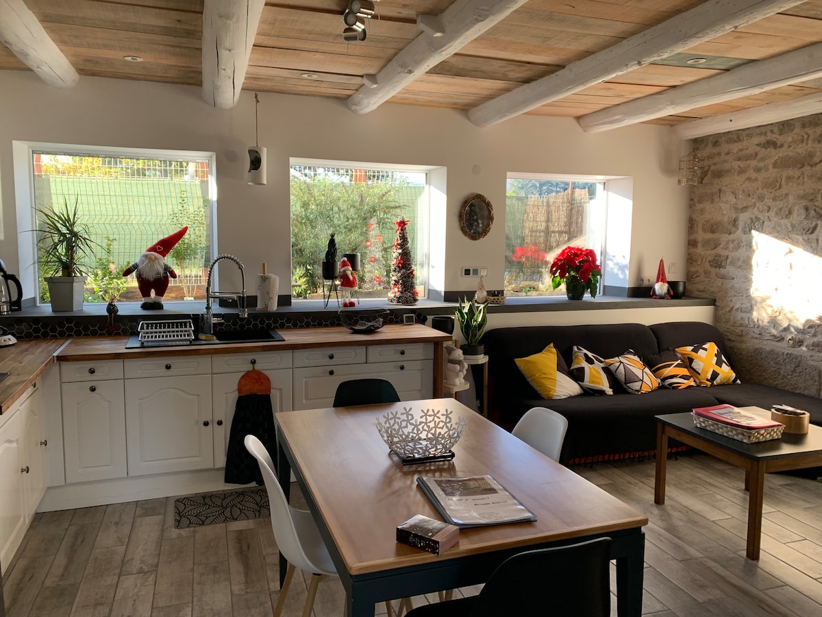 ✨ Cocoon con balneario en Mouchard ✨Jura ✨ 💕 Bienestar y romántico 🌿 Naturaleza y descubrimiento 👨👩👧 Familia y práctica Ideal para una estadía de bienestar o un fin de semana romántico. Apartamento con spa privado, cama de 160x200, sala de TV y cocina equipada. A dos pasos de los viñedos, salinas, termas y cascadas del Jura. Salins-les-Bains, Arbois, Port-Lesney y Arc-et-Senans. Estación y centro a poca distancia, estacionamiento cerca. Juegos, libros y cuna disponibles. Desconexión garantizada sin Wi-Fi 🌿