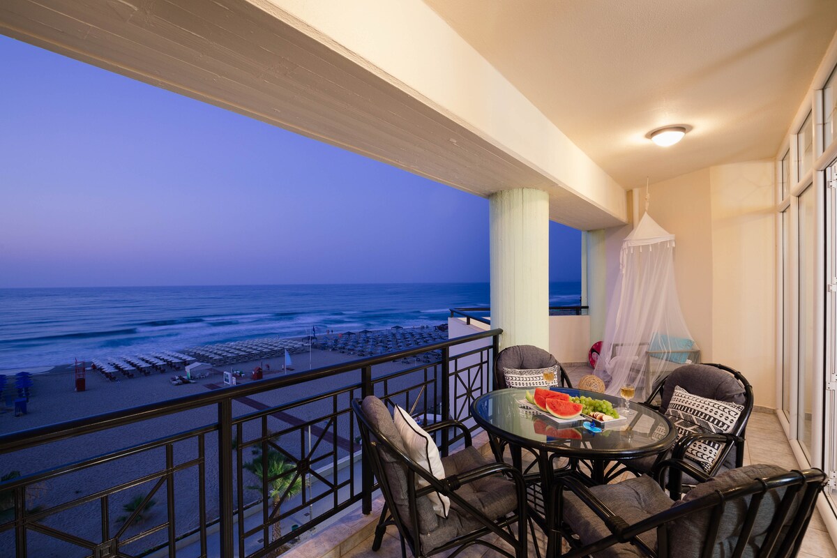 Disfruta de la mejor escapada frente a la playa de los apartamentos LaVieEnMer en nuestro lujoso apartamento situado en la impresionante carretera de playa de Rétino, a solo 10 metros del mar. Este nuevo apartamento ofrece impresionantes vistas al mar y un exquisito panorama al atardecer sobre el castillo y el casco antiguo desde el balcón privado. Lo más destacado es el jacuzzi interior junto a la cama donde puedes relajarte mientras contemplas el mar y escuchas el relajante sonido de las olas. Totalmente equipado con todos los servicios