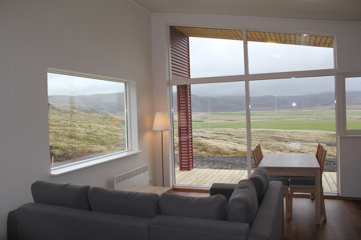 A warm and brand new house that is located between Vik and Kirkjubæjarklaustur. The cottage is by the farm Snæbýli 1 which is the last farm before heading on the mountain road (F210). It is 45m2 in size and is divided into two bedrooms, bathroom and then an open space where you have a fully equipped kitchen and living room with big windows and breathtaking view