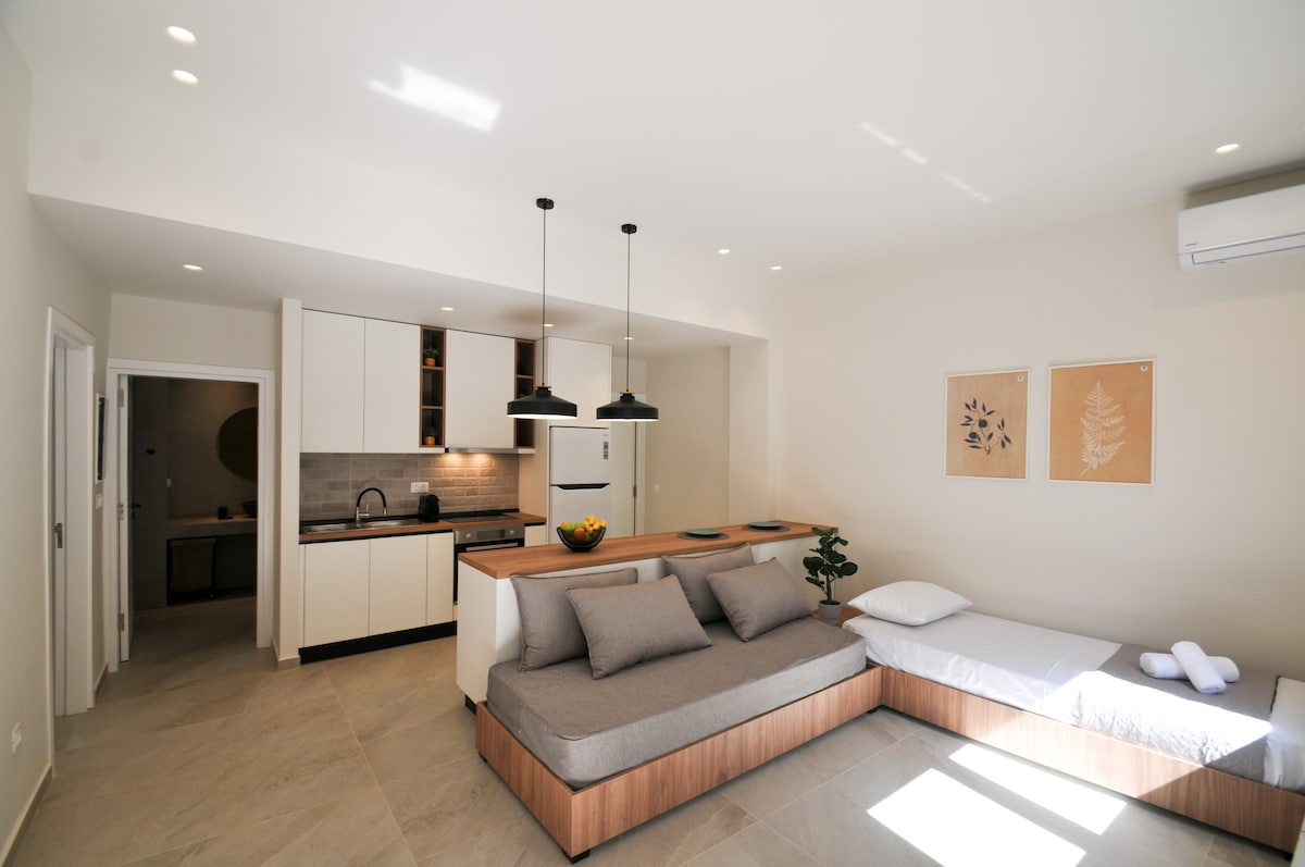 Disfruta de la máxima relajación en este elegante y totalmente equipado estudio con una impresionante vista panorámica al mar. El apartamento tiene una cómoda cama doble y un sofá cama, ideal para alojar hasta 3 personas. El patio privado con un salón al aire libre te invita a disfrutar de tu café o vino con vistas al infinito azul. Ideal para parejas, amigos o familias que buscan alojamiento de lujo con comodidad y estilo, lejos del ruido de la ciudad.