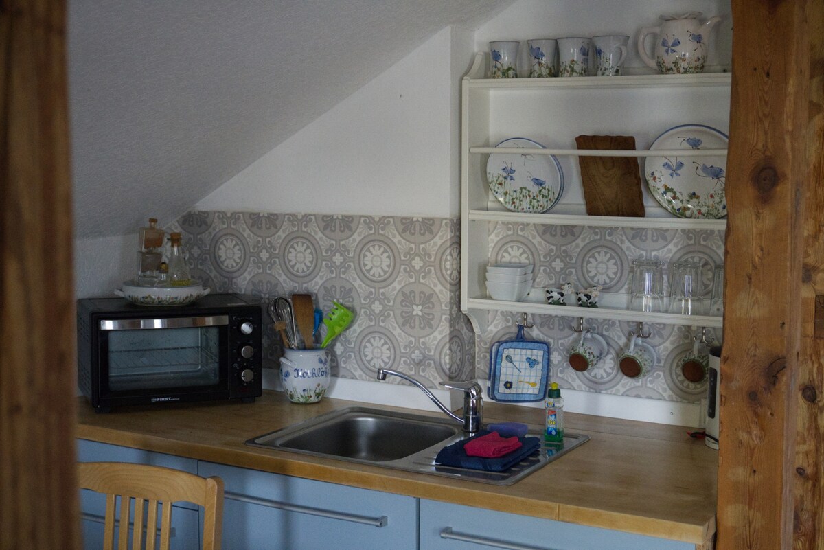 Casa de campo en dos niveles con 65 metros cuadrados. Cocina totalmente equipada, baño - inodoro, ducha a ras de suelo, lavadora, perchero; combinación de sala de estar / dormitorio en el ático abierto, terraza con parrilla, uso del jardín por acuerdo, espacio de estacionamiento para un vehículo, almacenamiento para bicicletas. 2 camas supletorias posibles € 20/noche/persona a partir de 5 años. Se pueden solicitar consejos para excursiones si es necesario, hay una carpeta de información disponible. De lo contrario, estaré disponible para el lema "¡Todo es posible, no hay que hacer nada!"