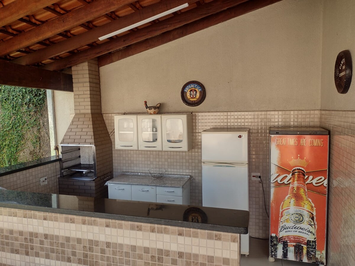 Varanda ampla acomoda 50 pessoas; 2 quartos, sendo um quarto com uma cama de casal e uma beliche e o outro quarto com uma cama de casal e duas beliches, hospedando 10 pessoas para dormir; 2 banheiros; Piscina ampla com prainha para as crianças, cascata e chuveirão; Churrasqueira Já incluso Gás (cooktop) Forno elétrico Cafeteria elétrica Panela, pratos e talheres WI-FI Tv Smart e Som ambiente 43 cadeiras 12 mesas 1 mesa de mármore Jogo de luzes 1 geladeira 1 cervejeira 1 cervejeira visor