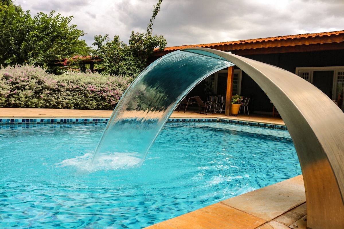 Disfruta de una estancia relajante en nuestra casa del árbol. La casa tiene 4 suites (3 con cama tamaño queen y 1 cama individual), todas con vistas a la piscina. La zona gourmet es ideal para reuniones, equipada con mesas, barbacoa, horno de pizza y leña. La piscina tiene una cascada y el jacuzzi para 2 personas es ideal para relajarse. El porche alrededor de la casa tiene tumbonas y mesa para 8, perfecto para comidas al aire libre. ¡Diviértete con familiares y amigos!