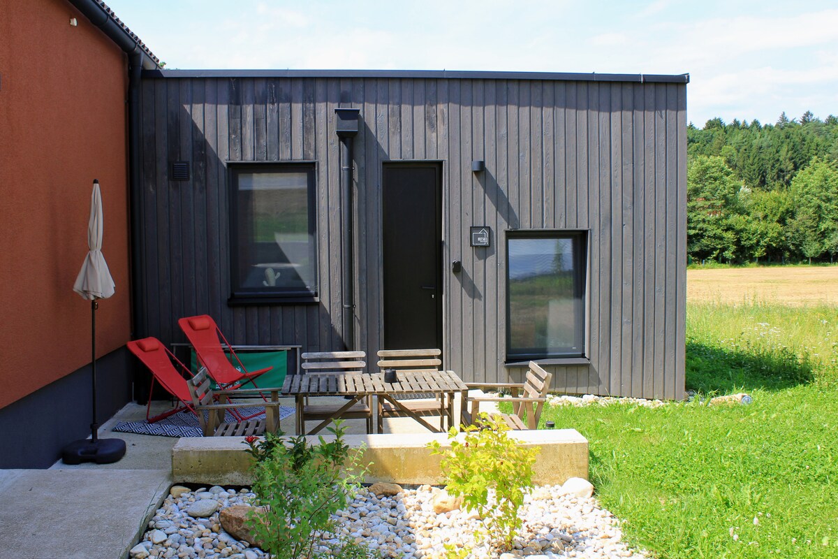 Apartamento tipo estudio de 30 m2 totalmente privado con salón, dormitorio, comedor y despacho TODO EN UNO con acceso al exterior: - Ventana con vistas al paisaje de prados - Cama de día extensible de 160x200 - Mesa grande, espacio de trabajo adicional - TV, cajita así como - Cocina americana independiente y baño con ducha y WC - Porche/terraza con asientos y barbacoa - dormitorio separado (+12 m2 + 2 personas) con cargo adicional, por favor pregunte - Zona popular para practicar senderismo y ciclismo, cerca del lago Stubenbergsee, el parque zoológico Herberstein y las termas