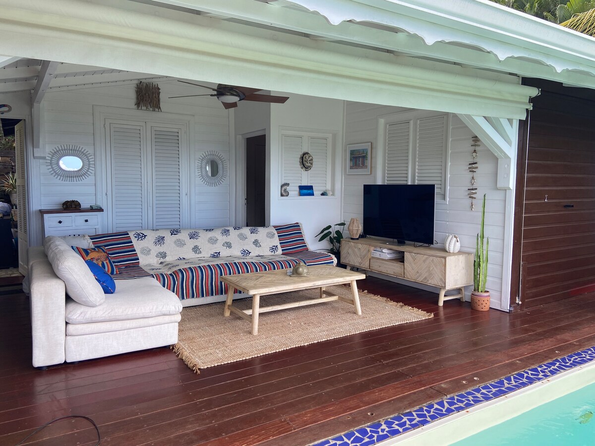 Magnífica villa frente al mar Caribe Alojamiento amueblado de turismo de 3 estrellas Venga en familia o con amigos y disfrute de la comodidad de tener cada uno su baño (ducha) y aseo separado La cocina abierta a la sala de estar está equipada con un horno multifunción de pirólisis, una placa de inducción, un microondas, un lavavajillas, una nevera grande con congelador, una lavadora, una secadora, una plancha y una tabla de planchar, una aspiradora Televisión wifi fibra Orange Terraza con piscina infinita Barbacoa