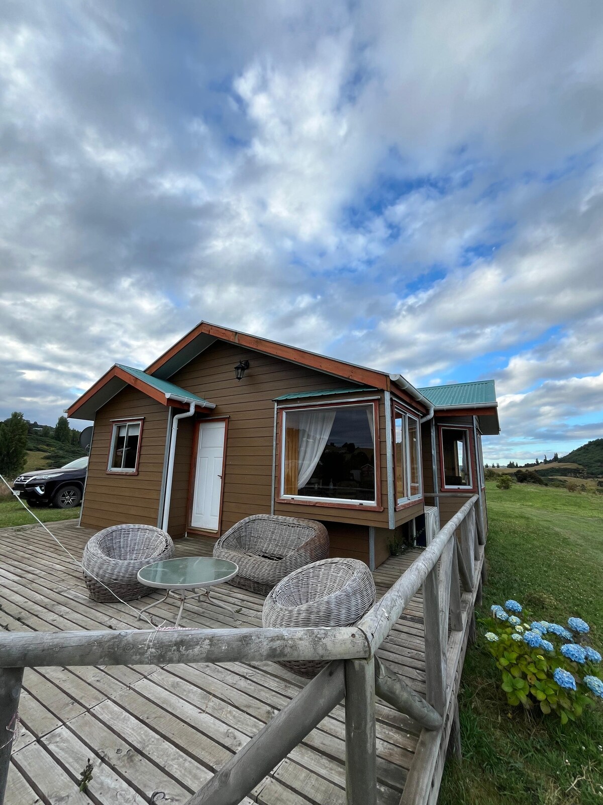 Cabañas nuevas y equipadas completamente, la cual tiene la comodidad necesaria para descansar y conocer la isla, ubicada en el corazón de chiloe, cuenta con una vista maravillosa y espectacular hacia la cordillera de los andes y archipiélago de chiloe. También zonas cercanas para trekking, running, nadar, andar en bicicleta y kayak.