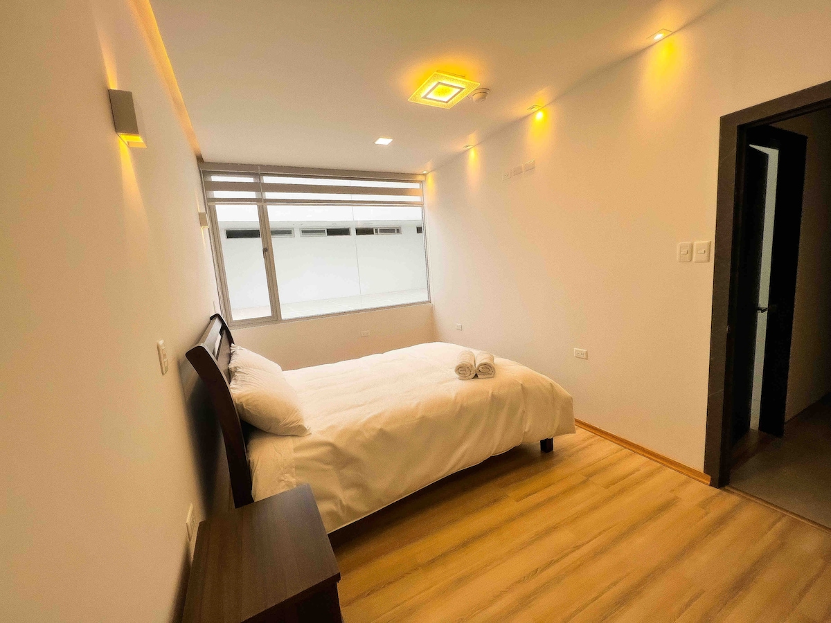 Departamento privado para ti y tus acompañantes. Ubicado a 5 minutos del centro de la ciudad caminando, nuevo y elegante este departamento está situado en una zona exclusiva y con varios restaurantes a su alrededor. Disfruta de WiFi, camas y colchones nuevos, agua caliente en toda la casa, televisiones con internet TVBox con más de 700 canales, ambiente familiar, edificio seguro, lavadora de ropa, cocina ollas utencillos de cocina, platos, vasos, cafetera, sistema de audio, parqueadero incluido