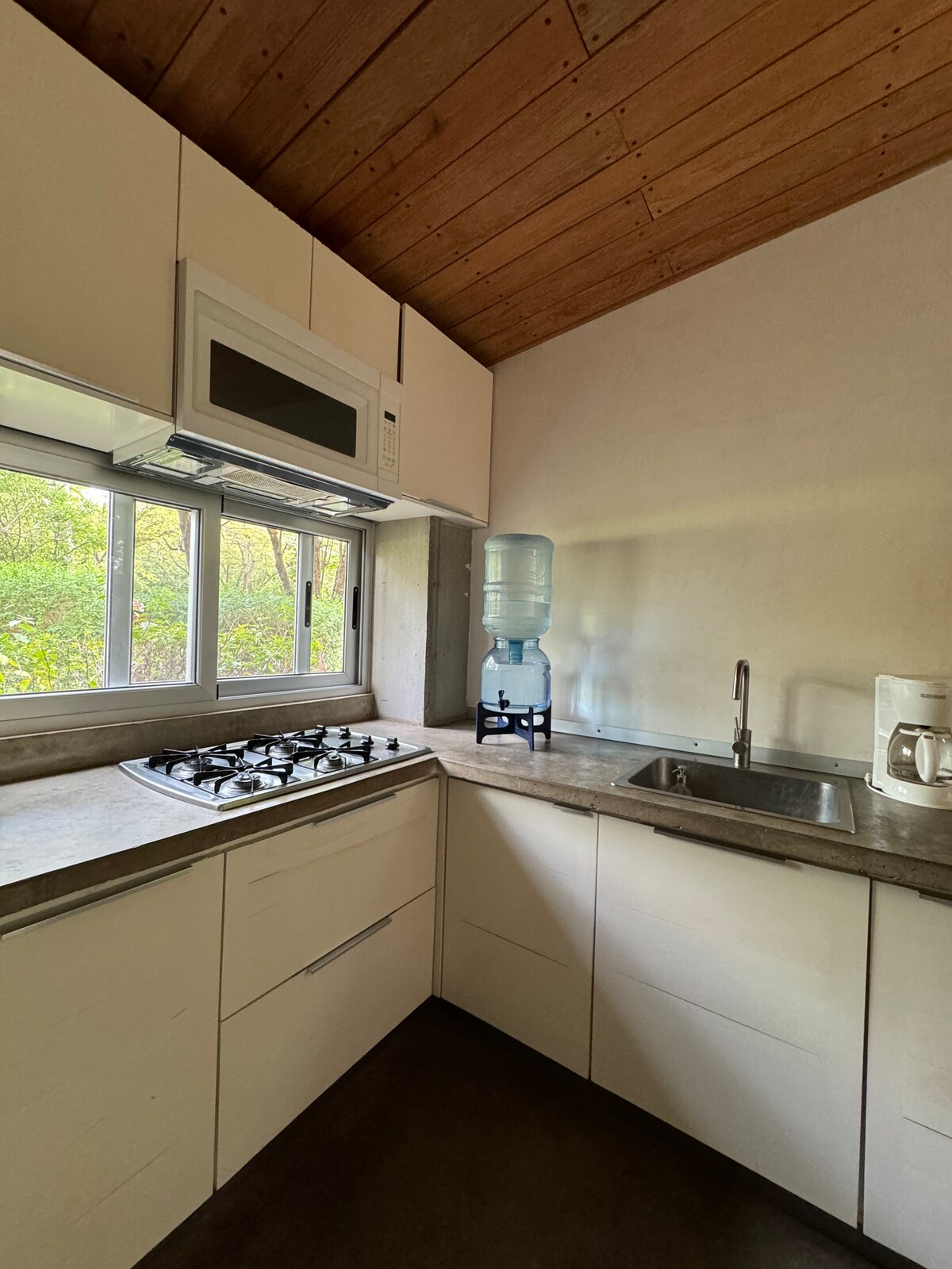 This newly remodeled studio offers a cozy stay for up to 2 people. It is located at the new La Joya commercial area in the middle of the eco casita phase 1 development within Hacienda Iguana. The unit is equipped with a small kitchen and office area. There is an air conditioning unit and fan in the living room and bedroom areas. We have a 55'' smart tv, and our WiFi is reliable. - 4 seater golf cart rental is available @ $50/day.