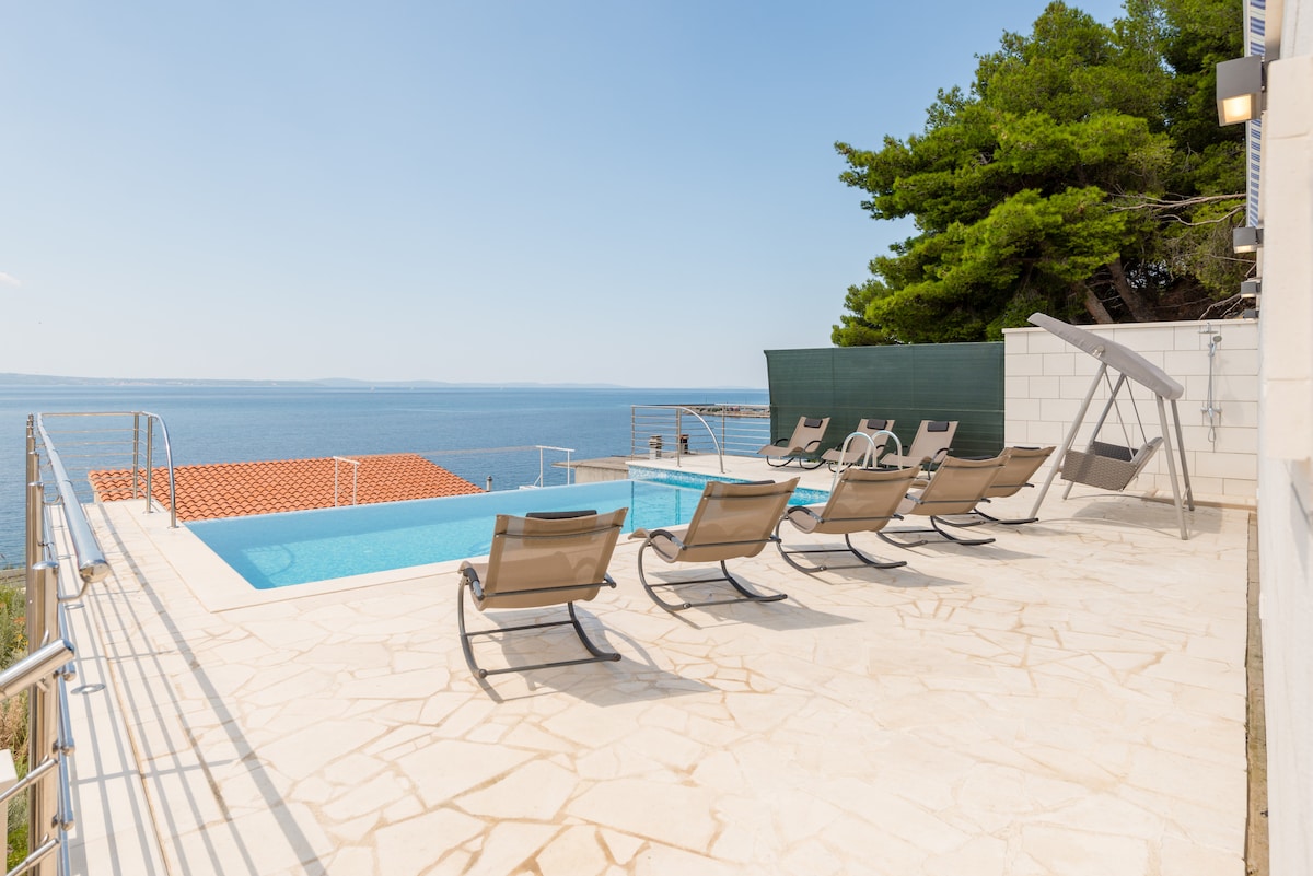 Apartamento de lujo con acceso a una piscina climatizada, llena de agua desde principios de abril hasta finales de octubre. La piscina cuenta con un potente sistema de natación a contracorriente, que te permite nadar sin parar sin tocar la pared. Si ambos departamentos (este y oeste) están alquilados, toda la casa y la piscina son exclusivas para tu grupo (hasta 12 personas). Disfruta de la hermosa vista al mar desde la terraza alrededor de la piscina.