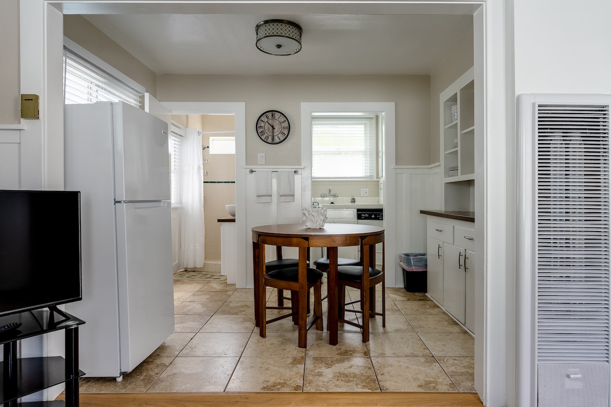 ¡DESCUENTO PARA ESTANCIAS LARGAS! Este elegante estudio de estilo granja está totalmente renovado y diseñado profesionalmente. Nuestro alojamiento puede alojar cómodamente hasta 4 personas. La casa incluye persianas opacas en todas partes, cama tamaño queen de espuma viscoelástica, unidad de aire acondicionado y calefacción, impresora, wifi rápido, TV por cable, TV inteligente de 65 pulgadas, cocina totalmente equipada con todos los utensilios de cocina y especias básicas, sábanas lujosas, champú/acondicionador/gel de baño, baño espacioso con ducha a ras de suelo grande y cesta de lavandería con lavadora/secadora en la unidad.