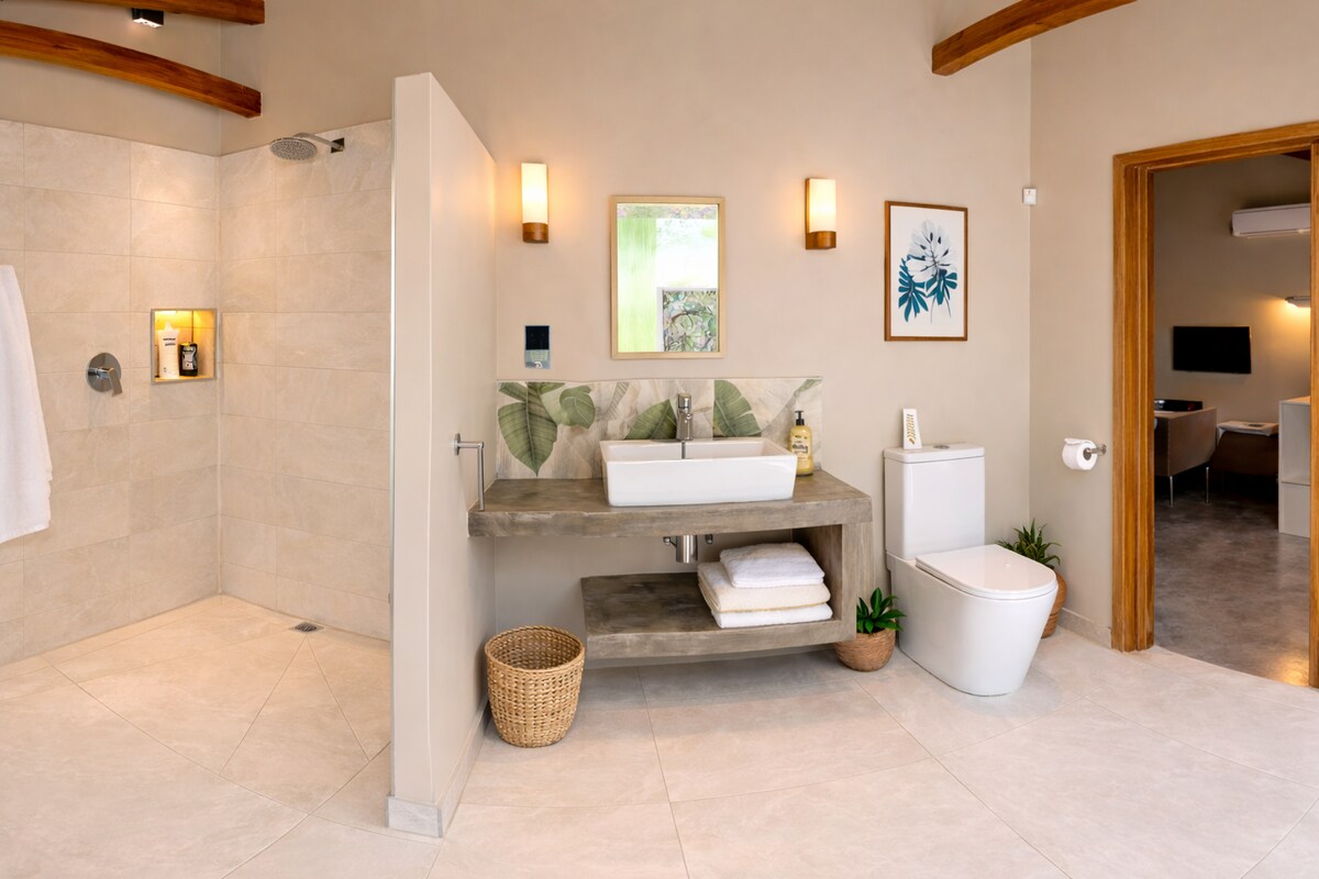 ¡Te damos la bienvenida a Vanilla Lodge, organizado por Jenni, Superanfitriona 20 veces! Relájate en una cama tamaño king de roble, cocina en la cocina totalmente equipada y transmite Netflix en el televisor inteligente. Refréscate en la ducha de piedra y bambú o disfruta del baño de piedra hundida para dos. Nada en la piscina infinita, descansa en las tumbonas y explora la isla en auto. A solo 5 minutos del océano, rodeado de exuberantes jardines tropicales, despierta con pájaros cantando. Desayuno no incluido.