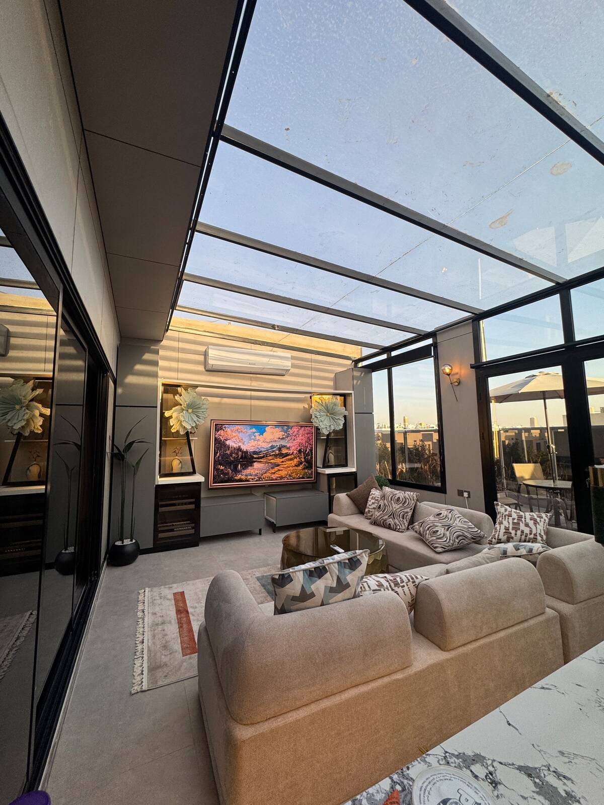 Penthouse de lujo con entrada independiente que consta de dos dormitorios, una sala de estar, un cine, una zona de estar al aire libre y dos baños totalmente equipados con champú, pantuflas, toallas y pañuelos de papel. • Ubicado en el complejo Rasf, distrito de Qurtubah Tanto el televisor de la sala de estar como el proyector de cine ofrecen acceso a las principales plataformas. (Netflix, YouTube, entre otros). La propiedad se encuentra en una ubicación estratégica cerca de: • Roshn Front (Riyadh Front): 6 minutos • Aeropuerto Internacional Rey Khalid – a 15 minutos
