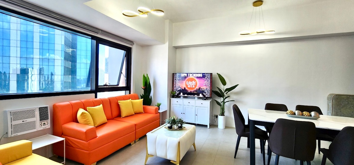 Alójate en un moderno apartamento de 1 dormitorio tipo hotel en Central Ortigas, a pocos pasos de Westin Sonata Place, SM Megamall y Shangri-La Plaza. La unidad cuenta con entrada sin llave, persianas opacas, cocina completa, ducha caliente, lavadora/secadora y aire acondicionado. Disfruta de las comodidades de un edificio de primera categoría, como piscina, gimnasio y sala de juegos, una base fácil y cómoda con una excelente relación calidad-precio en Ortigas.