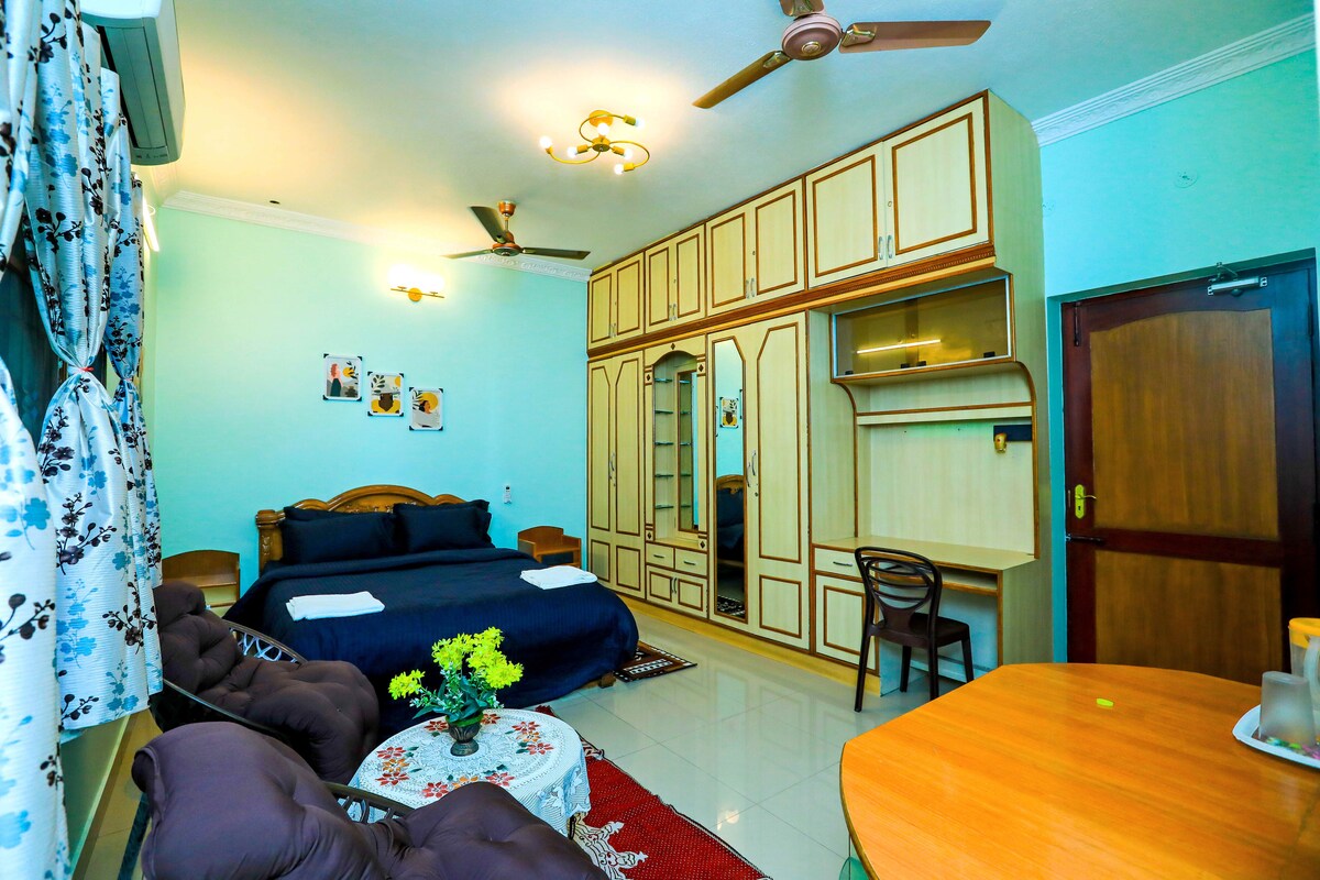 Completamente privado sin compartir ningún espacio, un apartamento pequeño de una habitación estudio con una losa para cocina y baño adjunto. Nuevo aire acondicionado, armario, cama tamaño queen con colchón de espuma ortopédica, ideal para dos huéspedes. El área de la cocina contiene inducción para cocinar con utensilios y recipientes de cocina. Conexión a Internet de alta velocidad para trabajar desde casa Google TV con todas las aplicaciones, aire acondicionado, nevera, horno, calentador de agua, sillas, plancha, etc., todo está ahí. Lugar totalmente ventilado con 2 grandes ventanales. Necesitamos un documento de identificación de todos los huéspedes.