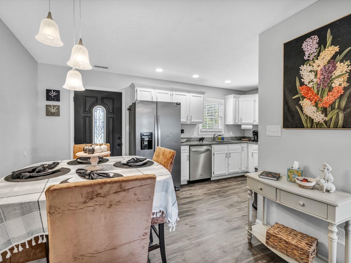METICULOSAMENTE LIMPIA, casa de 3 dormitorios actualizada, 4 camas cada una con TV, casa privada a 3 millas del centro de convenciones, River Park Center, Museo Bluegrass, Museo de Ciencias, Jardín Botánico. También está a pocos minutos de los campos de béisbol (Fischer), a 30 minutos de Holiday World, patio trasero privado y vallado con patio iluminado. ¡La casa está bien equipada con TODO lo que puedas necesitar! Si la casa está vacía la noche anterior, ¡llegada anticipada, sin cargo! - Wifi. - Roku TV en todas las habitaciones. - Lavadora y secadora. - Cocina equipada.