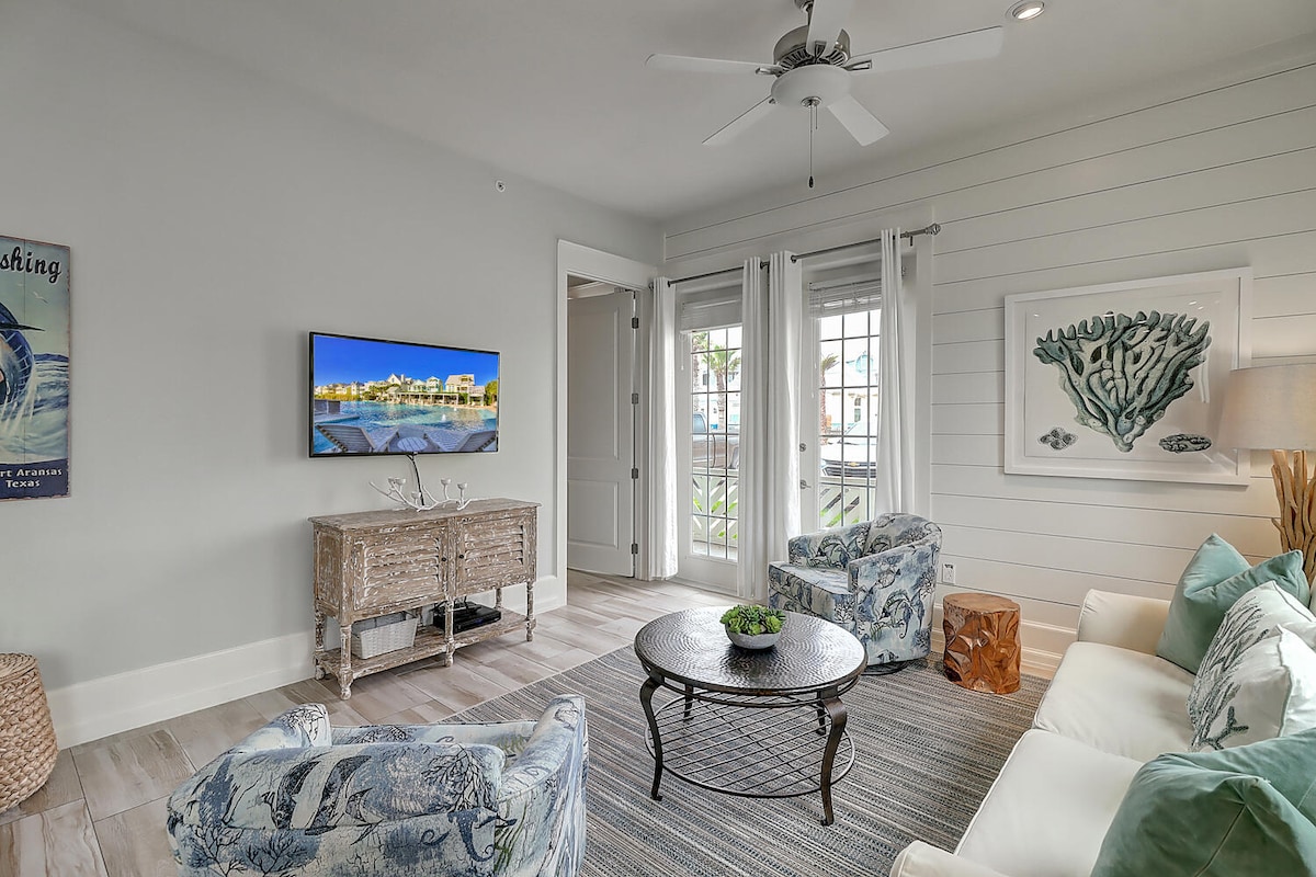 On the gorgeous Cinnamon Shore development, you're just a short walk to the beach, pools, and nearby restaurants and cafes. Enjoy beautiful Mustang island and the town of Port Aransas with your friends and family in this roomy 2 story condo with cathedral ceilings, 2 king bedrooms, and tons of space for kids in the heart of Cinnamon Shore's original Town Center! You’ll love it because of the location, the high ceilings, and the views. It's a great place for groups and families with kids!