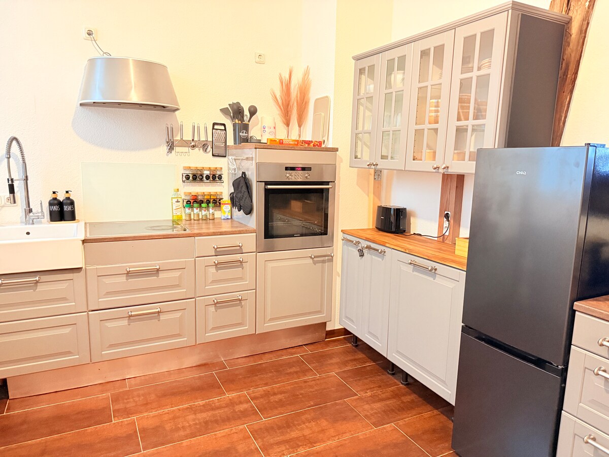 Die Wohnung wurde komplett saniert und erhielt neue Möbel. Es gibt ein Bad mit bodengleicher Dusche und eine neue Küche, die gut ausgestattet ist. Die Wohnung bietet Platz für 2-4 Personen. Das Schlafzimmer für 2 und eine Schlafcouch für 2 im Wohnzimmer. Ruhige Lage! Der große Garten mit mehreren Sitzplätzen hinter dem Haus kann genutzt werden. Parkplatz ist vor dem Haus. WLan ist vorhanden.