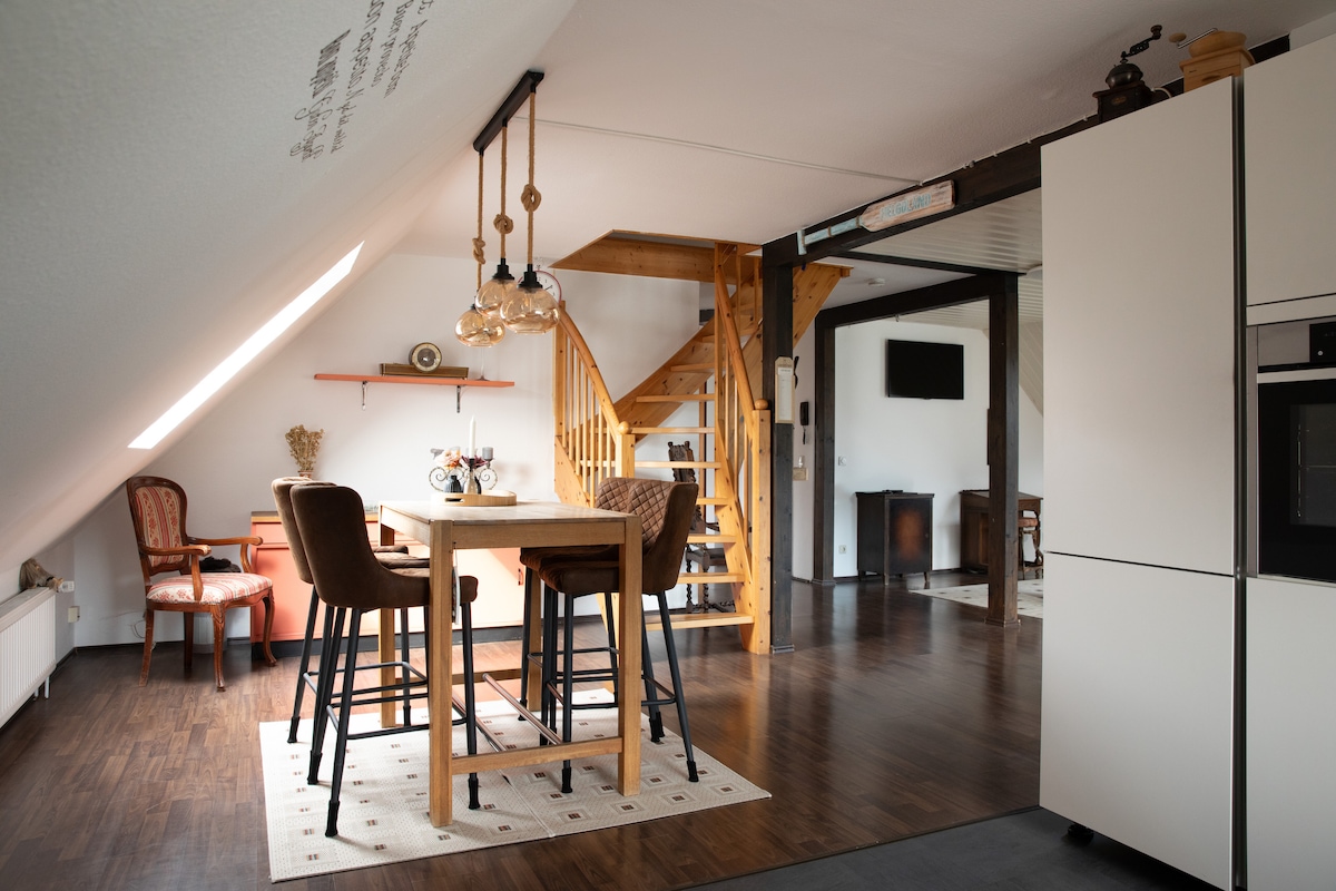 El pequeño apartamento se encuentra en una antigua granja que se convirtió en apartamentos. El encanto del apartamento con las vigas antiguas invita a relajarse y desconectar. Una gran parcela asociada se puede utilizar para hacer un picnic o tomar el sol. En el patio hay suficientes posibilidades de aparcamiento. El apartamento está situado en Düshorn, un pequeño pueblo en el brezal de Lüneburg. Hay una panadería y una tienda de comestibles, en Walsrode, a 3 km, hay numerosas tiendas.