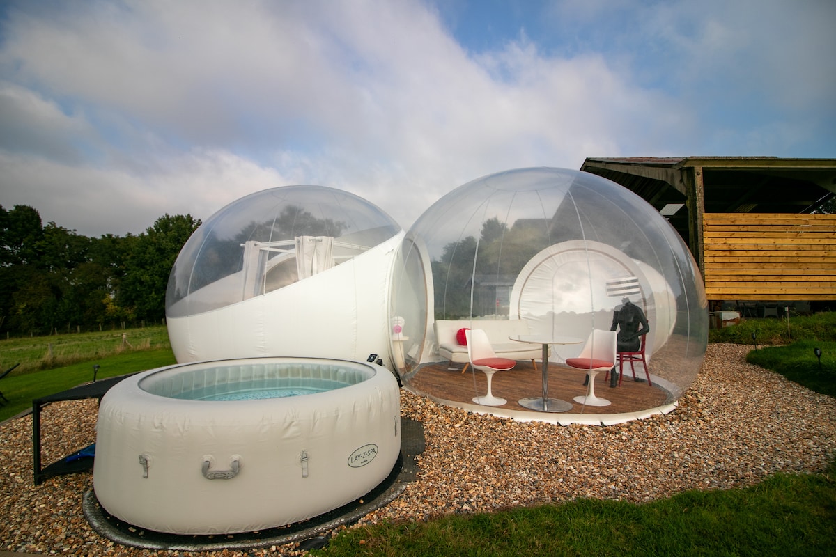 The Bubble, which works on a slightly over pressurised system where the air continuously refills the tent is set up on an old working farm. Its the ultimate experience of nature and total comfort. Guests can fully enjoy the peaceful surroundings and wonderful open farmland. Sit back in your very own private hot tub and enjoy the view of the rolling fields. This accommodation has air conditioning. Not suitable for children under 4 We have other bubbles see them by pressing on my profile