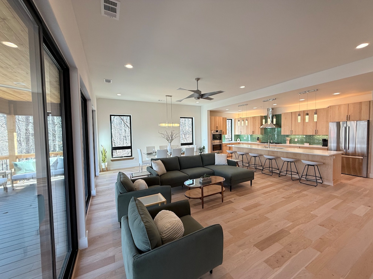 * ¡Descuentos de 3, 4 y 5 días aplicados automáticamente! * ¡Escapada en nuestro refugio aislado y moderno con todas las comodidades de un hogar! Apodado el " Mod Lodge" con 2 camas tamaño king y 5 camas tamaño queen, este lote boscoso de gran tamaño se encuentra directamente en el sistema de senderos Little Sugar con acceso directo al sendero y una increíble cascada, lagos y lugares de ciclismo de montaña cercanos. A menos de 1 milla de la capilla Mildred B Cooper. Internet rápido, cargador Tesla/EV, el centro perfecto para tu próxima escapada.