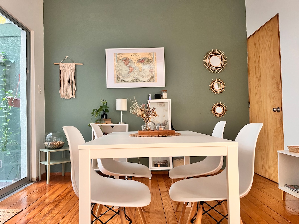 With an unbeatable location in the heart of the Roma Norte neighborhood, is steps away from great cafes, restaurants and galleries. Thoughtfully newly decorated by a recognized European interior designer based in Mexico, the apartment is full of magical touches and its walls are filled with artwork from Mexican and foreign artists. The dining area will make you live an unforgettable experience. In the terrace you can relax and dine al fresco in complete peace and privacy. Unique apartment!!!