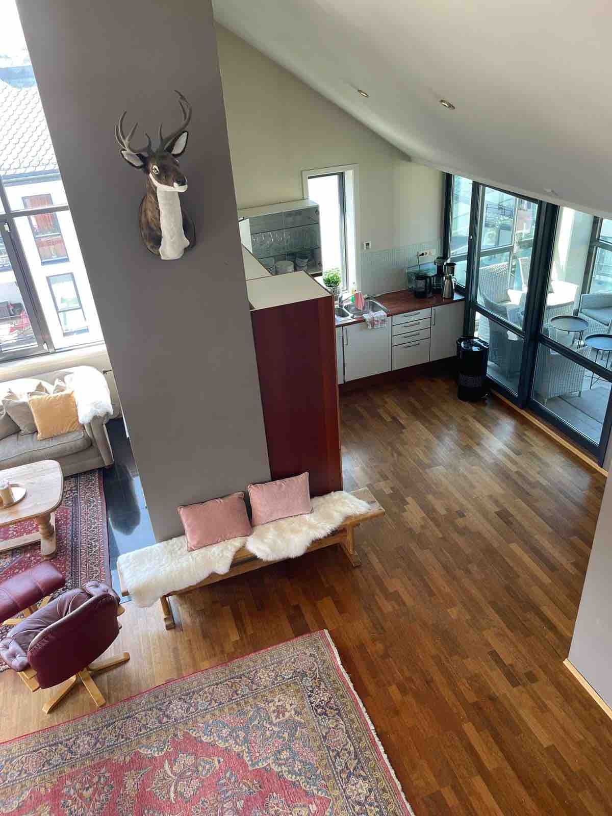 This beautiful penthouse on the top floor of an appartment building in the heart of Ålesund has a stuning view over the fjord, a big living room, free wifi, full equiped kitchen, 2 balconies and much more. The city center is just 200m away. There is a supermarket situated on the groundfloor of the building. There are also many possibilties to book excursions! The appartement has one privat parking lot but under the building you can also park more cars. The parking rate is around 200 NOK a day.