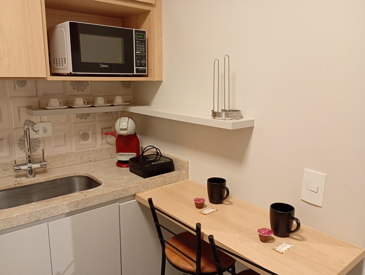 Ambiente totalmente privado y bien equipado, con cocina, baño y dormitorio, todo muy limpio y agradable, con garaje cubierto para automóvil, no se adapta a camionetas, por ejemplo, Amarok, S10. A 7 km del centro de la ciudad. Nuestro estudio te proporcionará una gran experiencia. Y tenemos varios puntos comerciales cerca, a menos de 2 minutos en auto, mercado, gimnasio, pizzería, restaurante, gasolinera, farmacia. Ideal para tus vacaciones o estancias rápidas de una noche en la ciudad, con seguridad y tranquilidad.