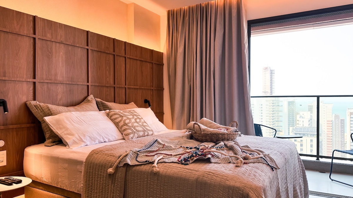 Experimenta la exclusividad en un espacio único en Fortaleza. Nuestro estudio es ideal para el ocio o el trabajo, con un diseño interior elegante y funcional, para el máximo confort. Disfruta de la impresionante vista y de una azotea completa: piscina infinita climatizada, gimnasio y Sky Lounge en el piso 28. Garantizamos tu tranquilidad con seguridad las 24 horas. Explora la ciudad y disfruta de paquetes especiales para momentos inolvidables. ¡Te esperan comodidad, buen gusto y una experiencia de estancia de primera!